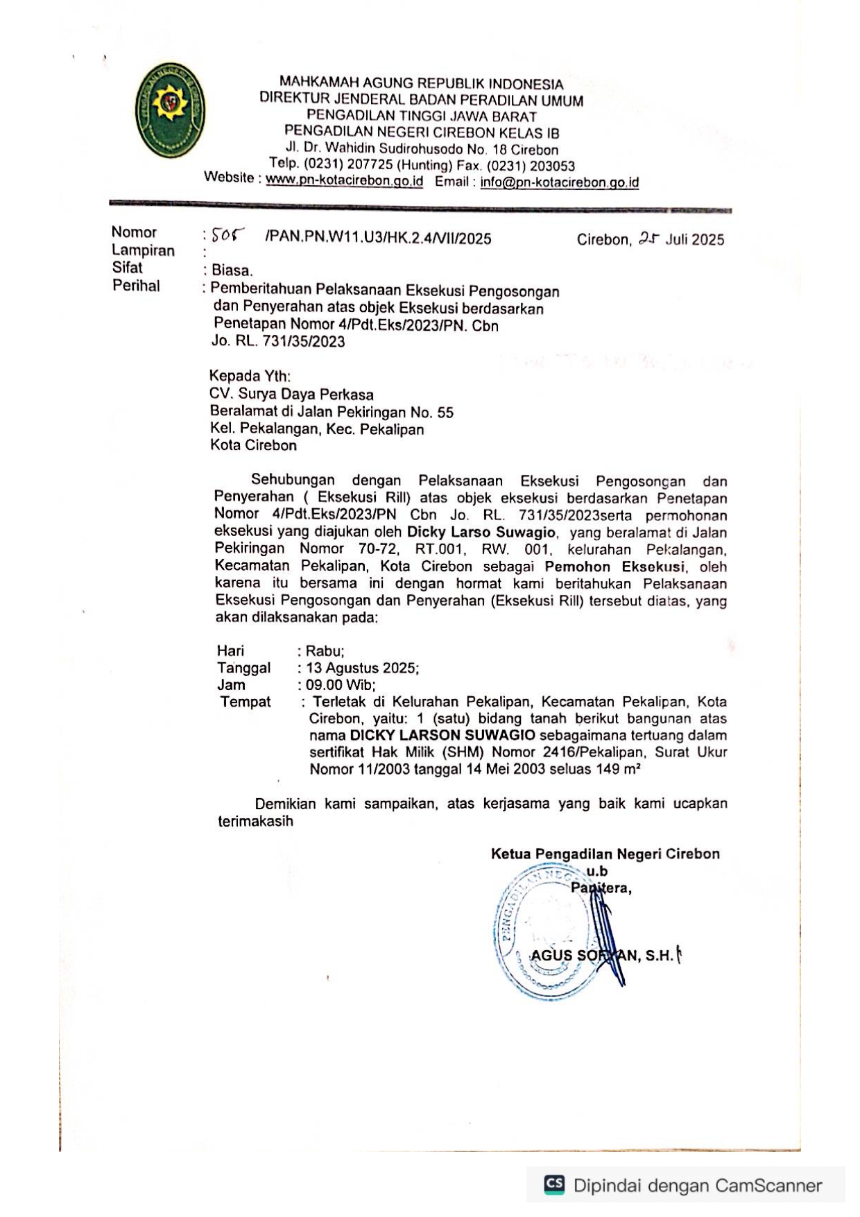 Pemberitahuan Pelaksanaan Eksekusi Pengosongan dan Penyerahan atas objek Eksekusi berdasarkan Penetapan Nomor 4/Pdt.Eks/2023/PN. Cbn Jo. RL. 731/35/2023