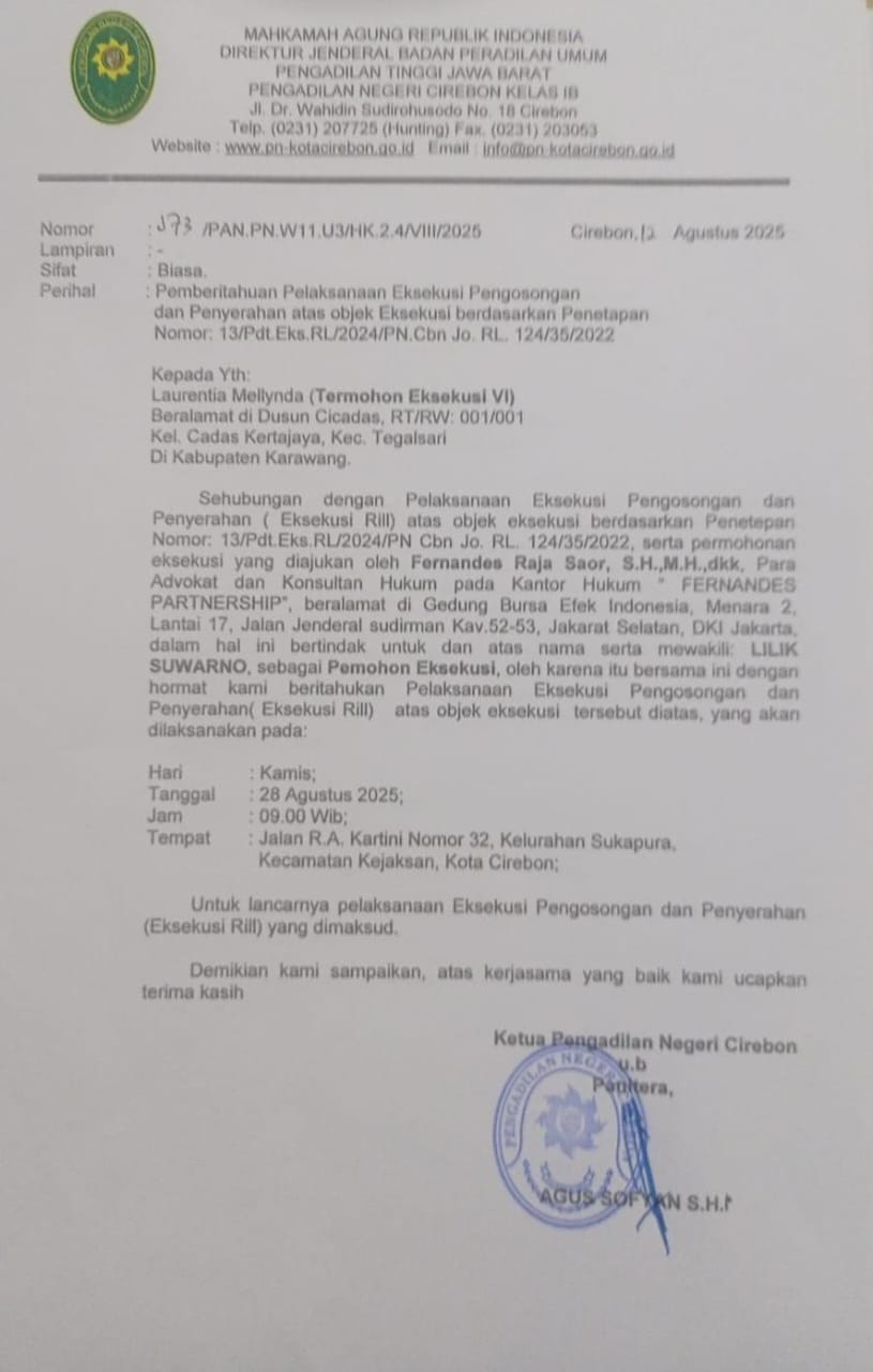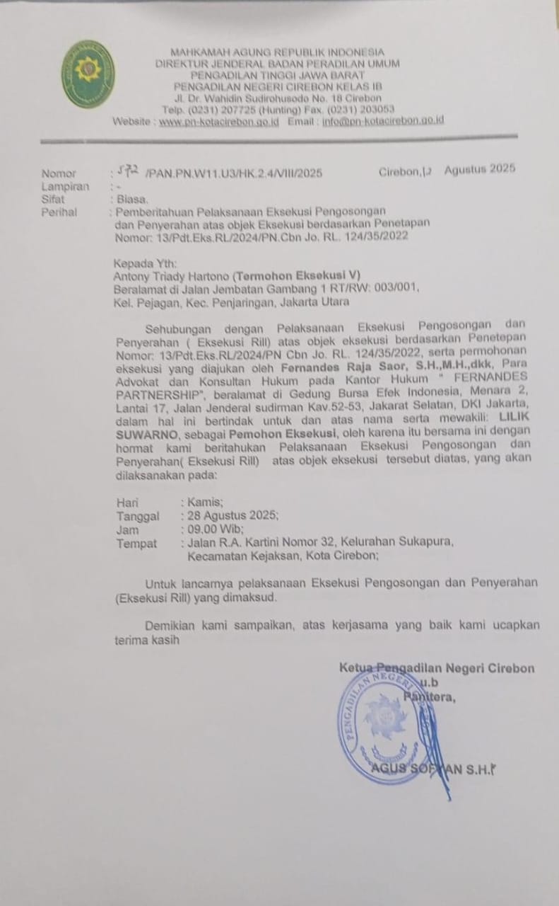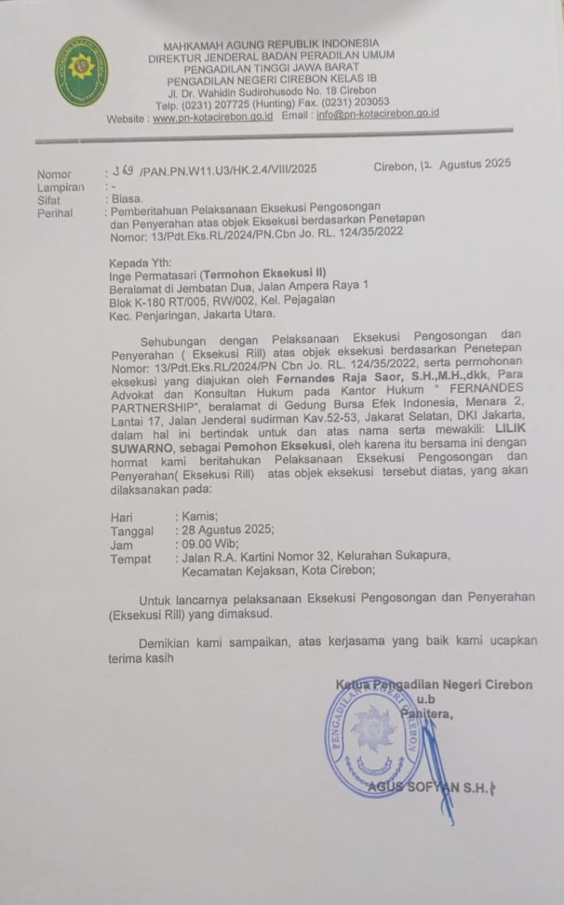 Pemberitahuan Pelaksanaan Eksekusi Pengosongan dan Penyerahan atas objek Eksekusi berdasarkan Penetapan Nomor 13/Pdt.Eks.RL/2024/PN. Cbn Jo. RL. 124/35/2022