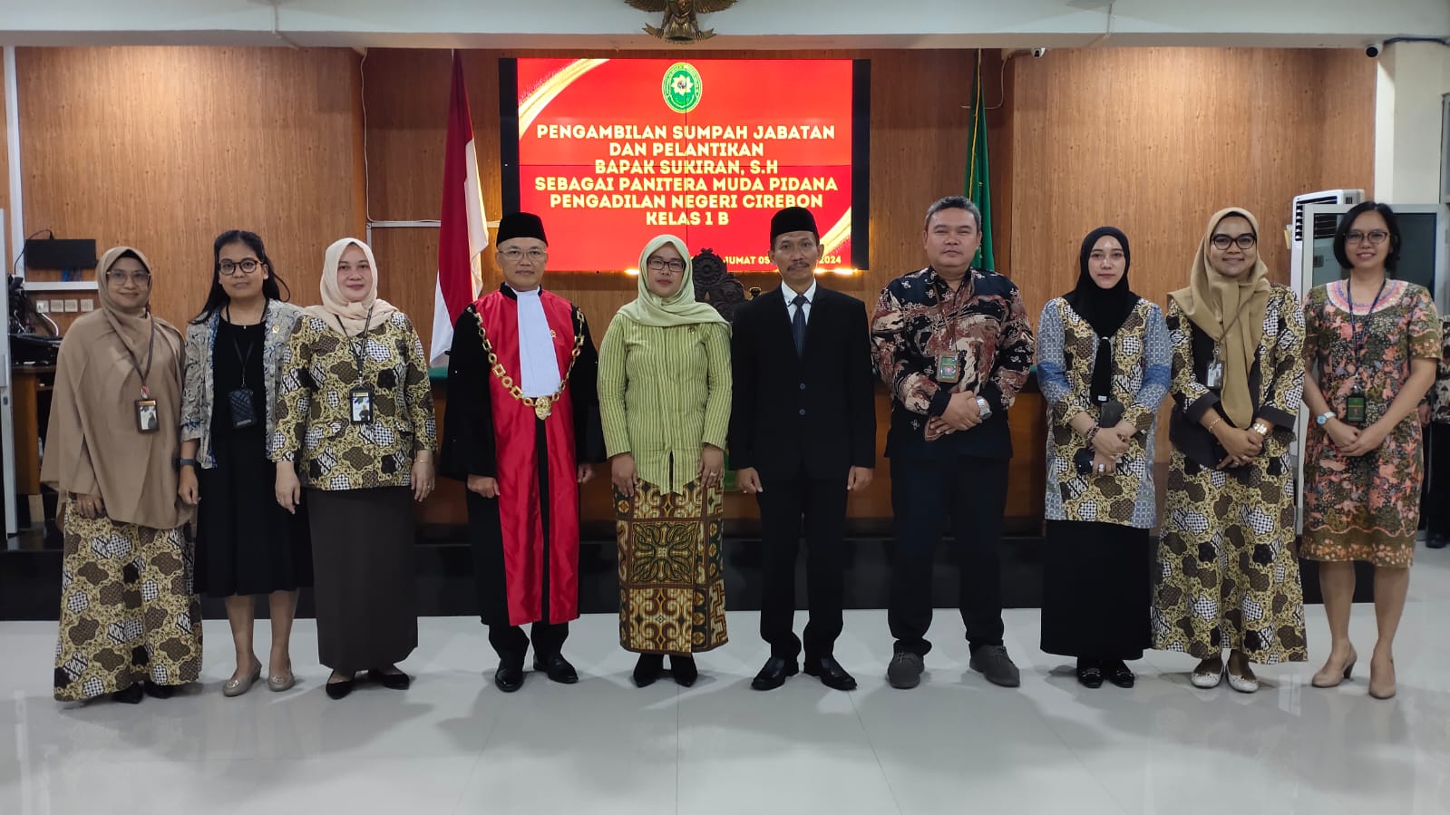 Cirebon, 5 Januari 2024, bertempat di Ruang Sidang Cakra Pengadilan Negeri Cirebon Kelas 1B, dilaksanakan Acara Pengambilan Sumpah dan Pelantikan Panitera Muda Pidana Pengadilan Negeri Cirebon Kelas 1B Bapak SUKIRAN, S.H. Acara Pelantikan dipimpin oleh Ketua Pengadilan Negeri Cirebon YM Bpk. Dr. ANDI JULIA CAKRAWALA, S.H., M.T., M.H. dengan saksi Bapak, DIMAS SANDI KRESNHA, S.H., dan Bapak TJETJE SURYADI, S.H., acara ini di hadiri oleh seluruh Hakim, Pejabat Struktural/ Fungsional dan seluruh pegawai Pengadilan Negeri Cirebon Kelas 1B, acara berlangsung dengan lancar dan hikmat dan ditutup dengan pemberian ucapan selamat kepada pejabat yang baru dilantik, ucapan diawali oleh Bapak Ketua dan dilanjutkan oleh para Hakim, Pejabat Struktural/Fungsional dan oleh seluruh keluarga besar Pengadilan Negeri Cirebon Kelas 1B.,