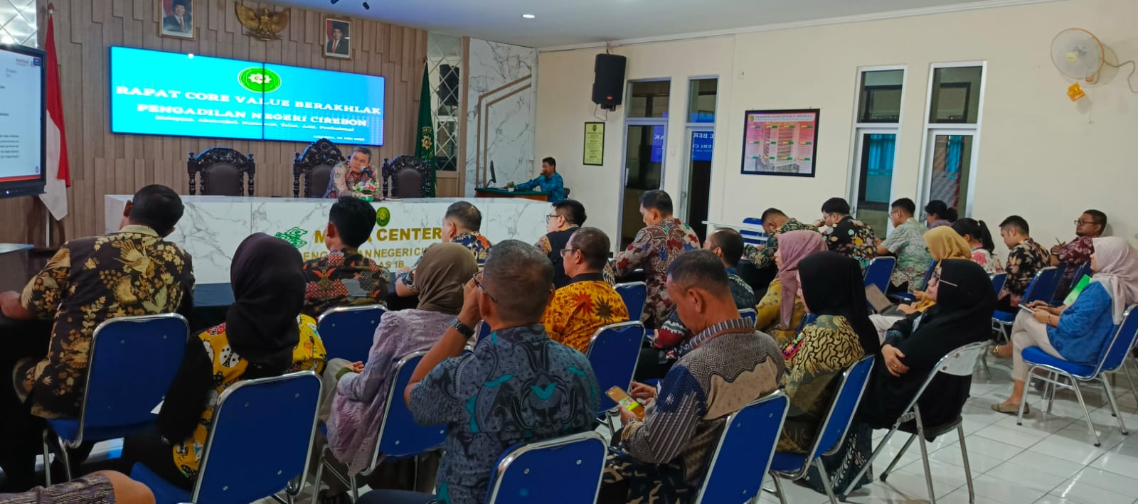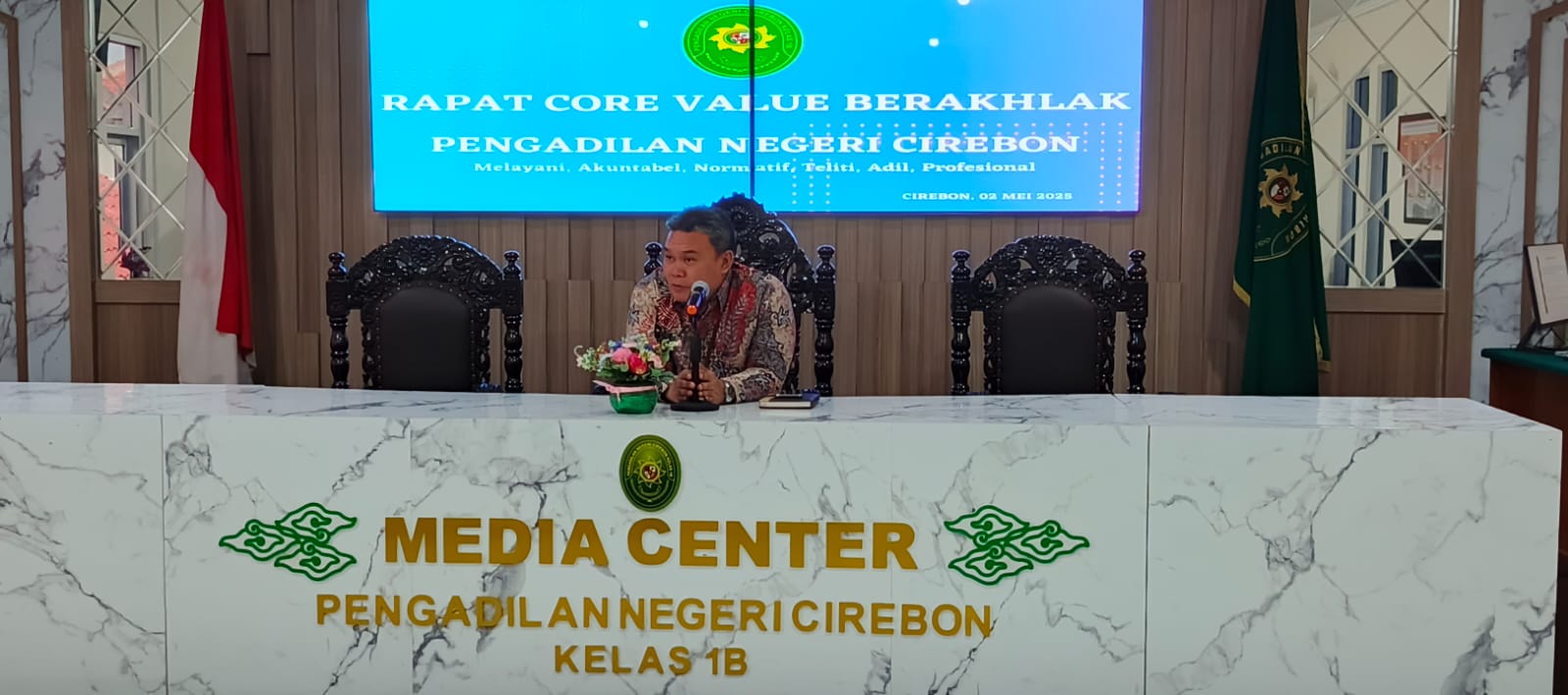 Cirebon, 2 Mei 2025. Bertempat di Ruang Media Center Pengadilan Negeri Cirebon dilaksanakan Sosialisasi Core Values ASN BerAKHLAK (Berorientasi Pelayanan, Akuntabel, Kompeten, Harmonis, Loyal, Adaptif, dan Kolaboratif) dipimpin oleh Wakil Ketua Pengadilan Negeri Cirebon, Bpk. AGUS ARDIANTO,S.H.,M.H yang dihadiri oleh para Hakim,Panitera, Sekretaris, Pejabat Struktural dan Pejabat Fungsional beserta Pegawai Pengadilan Negeri Cirebon.