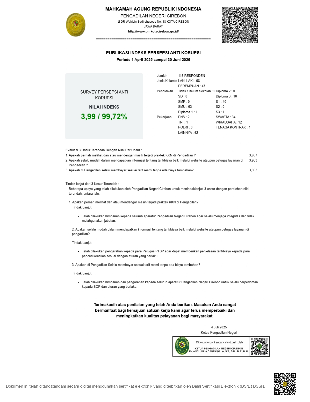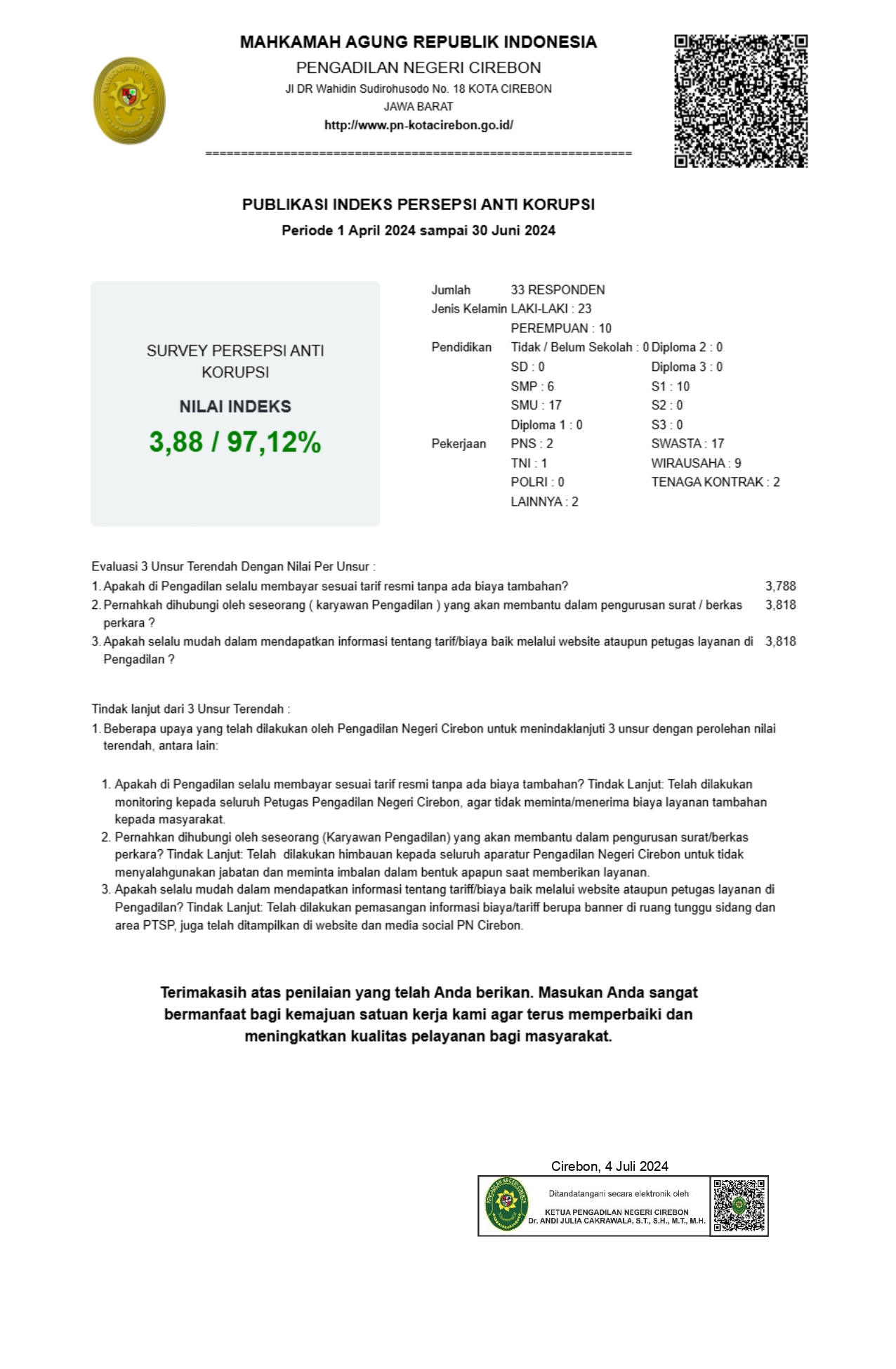 Laporan Monitoring dan Evaluasi Indeks Persepsi Korupsi (IPK) Triwulan II Tahun 2024 Pengadilan Negeri Cirebon Kelas 1B, Klik e-Doc