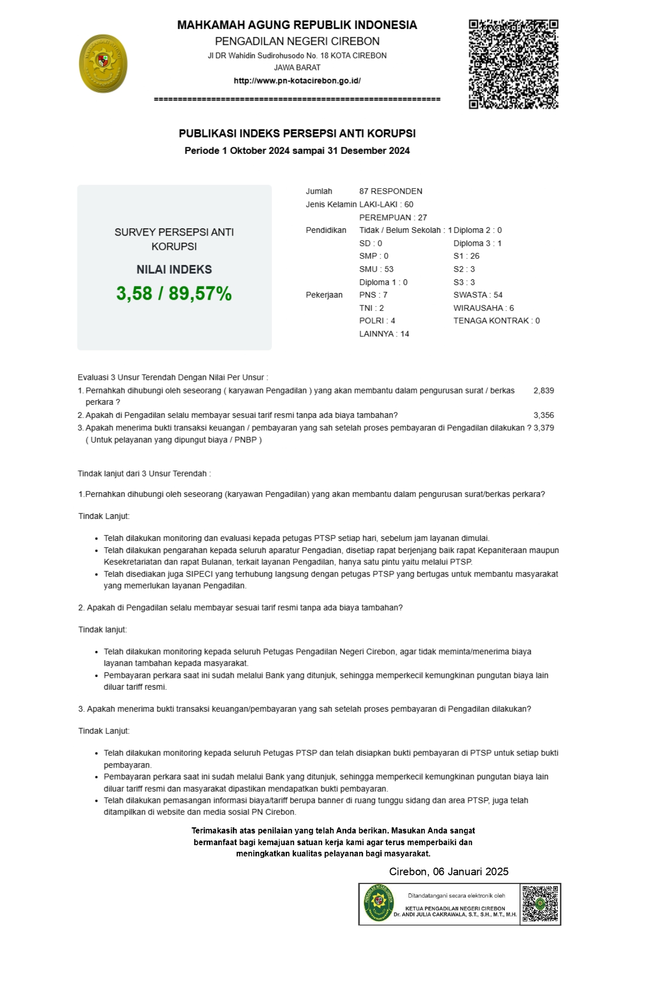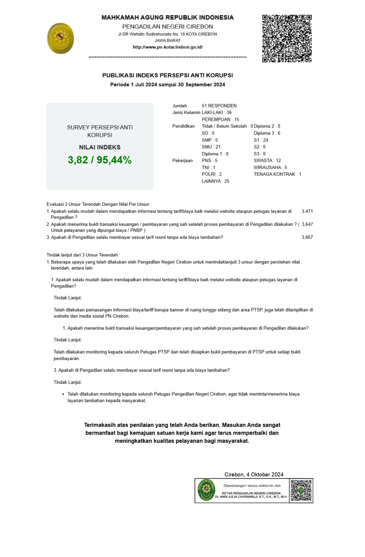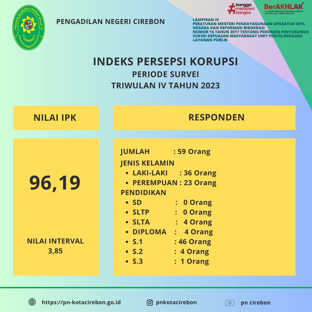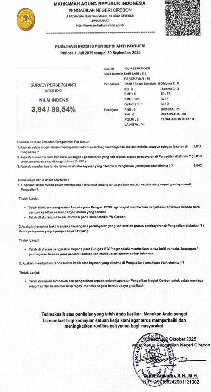 Laporan Monitoring dan Evaluasi Indeks Persepsi Korupsi (IPK) Triwulan III Tahun 2024 Pengadilan Negeri Cirebon Kelas 1B, Klik e-Doc