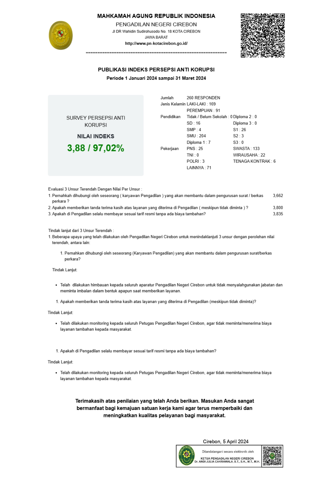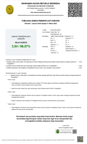Laporan Monitoring dan Evaluasi Indeks Persepsi Korupsi (IPK) Triwulan I Tahun 2024 Pengadilan Negeri Cirebon Kelas 1B, Klik e-Doc