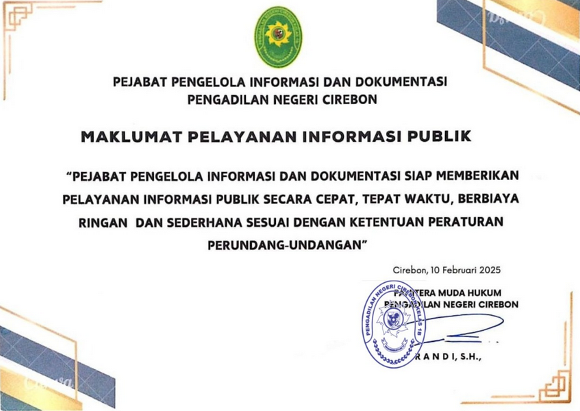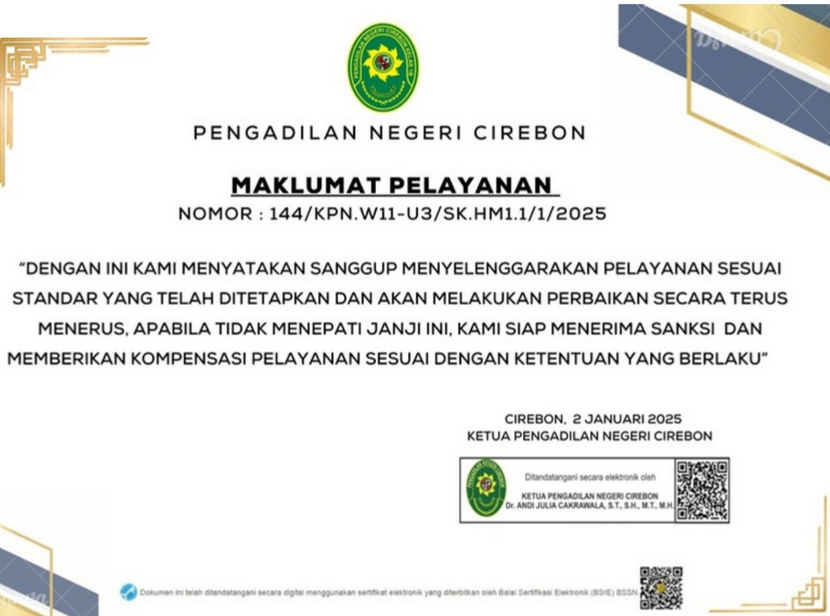 Standar & Maklumat Pelayanan pada Pengadilan Negeri Cirebon mengacu pada :