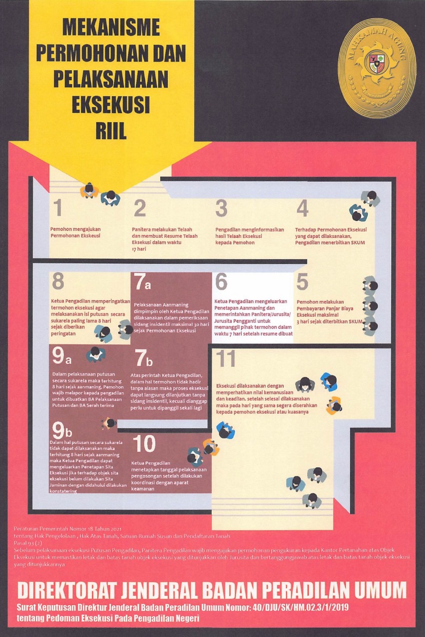 Berikut ini adalah Mekanisme Permohonan Dan Pelaksanaan Eksekusi Riil berdasarkan Surat Keputusan Direktur Jenderal Badan Peradilan Umum Nomor 40/DJU/SK/HM.02.3/1/2019 tentang Pedoman Eksekusi Pada Pengadilan Negeri
