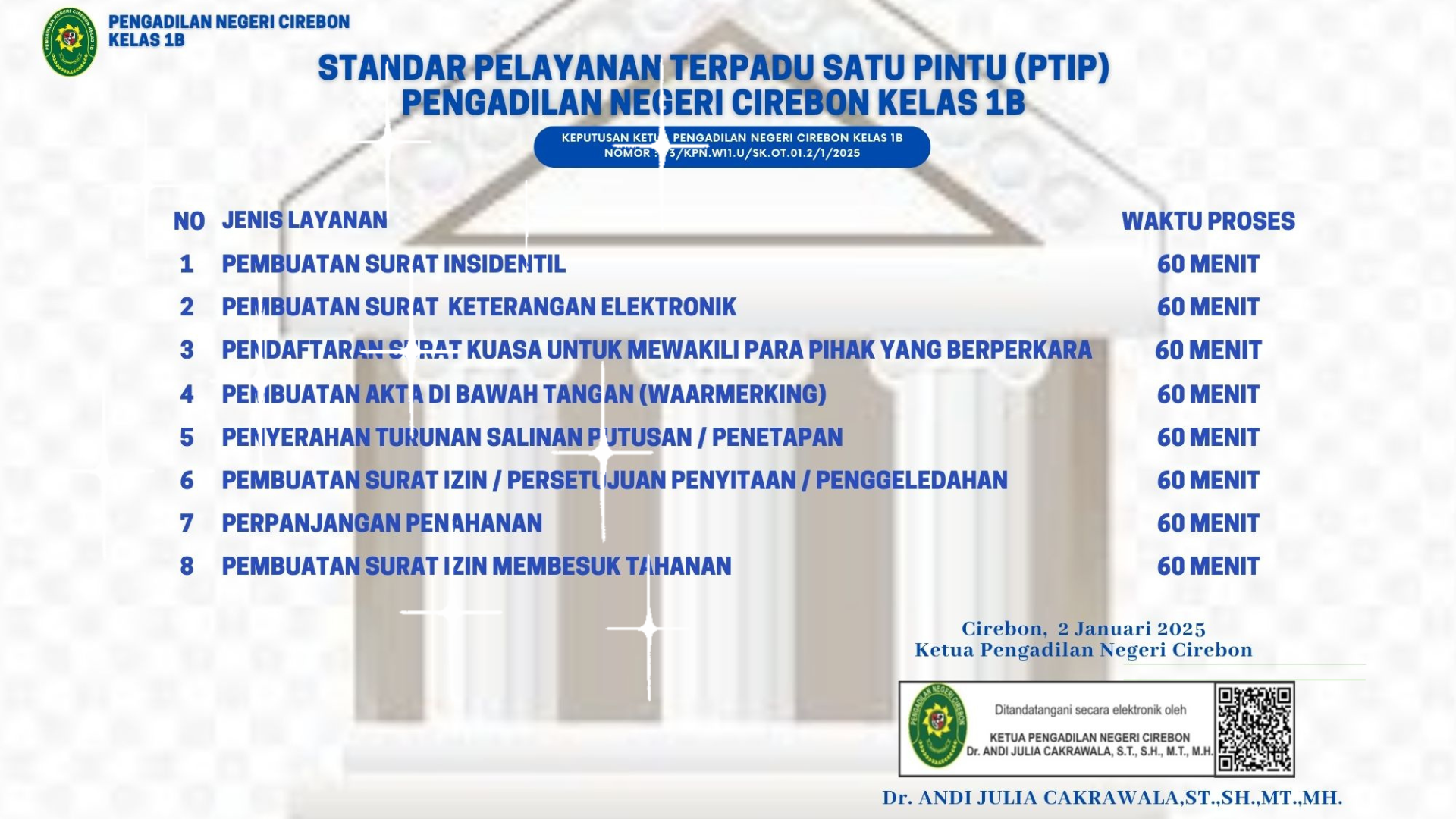 Keseluruhan Proses Pelayanan pada Pengadilan Negeri Cirebon wajib memperhatikan Standar Pelayanan yang telah ditetapkan oleh Ketua Pengadilan Negeri Cirebon.