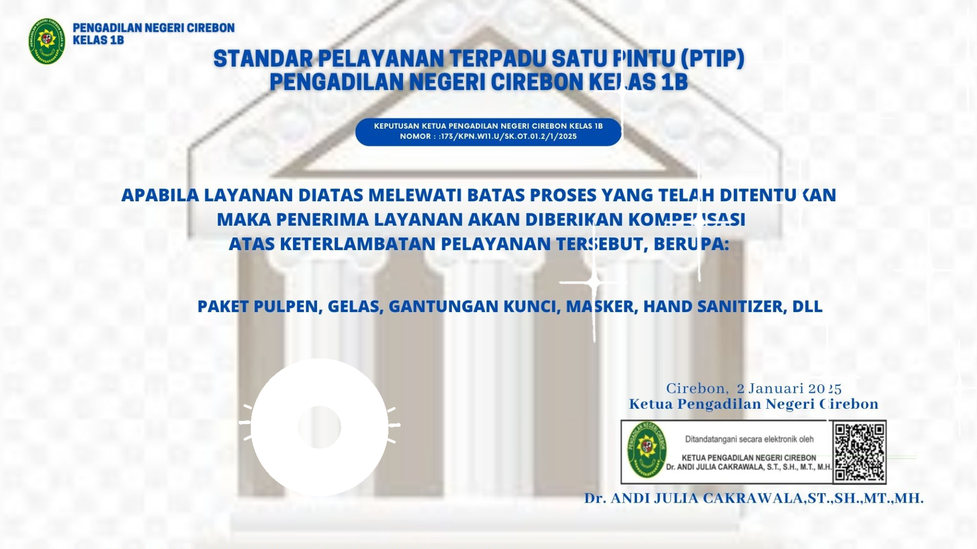 ♦ SK DIRJEN BADILUM No. 114/DJU/SK.HM1.1.1/I/2024, Tentang Pembaruan Pedoman Standar Pelayanan Terpadu Satu Pintu (PTSP) pada Pengadilan Tinggi dan Negeri Klik e-Doc