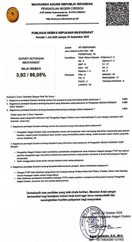 Laporan Monitoring dan Evaluasi Indeks Kepuasan Masyarakat (IKM) Triwulan III Tahun 2024 Pengadilan Negeri Cirebon Kelas 1B, Klik e-Doc
