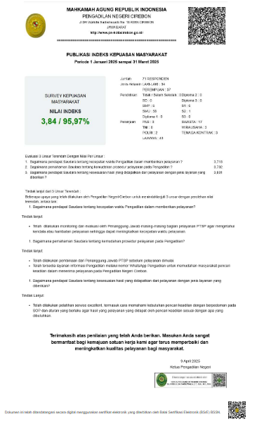 Laporan Monitoring dan Evaluasi Indeks Kepuasan Masyarakat (IKM) Triwulan I Tahun 2024 Pengadilan Negeri Cirebon Kelas 1B, Klik e-Doc